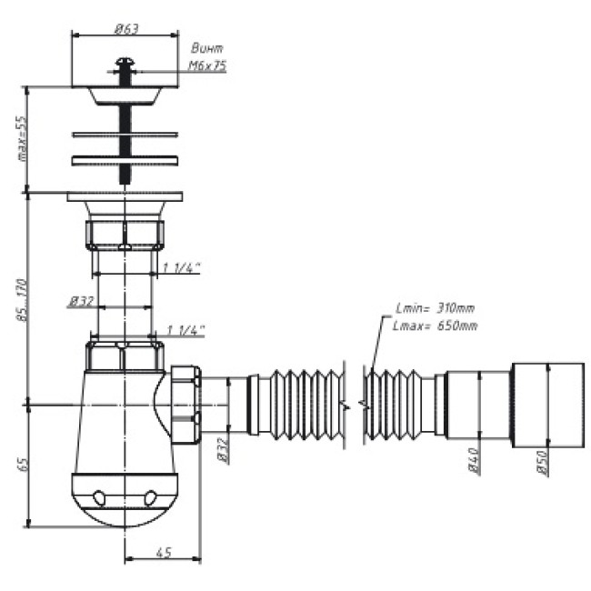 | Диаметр выхода гибкой трубы, мм | 40 / 50 |