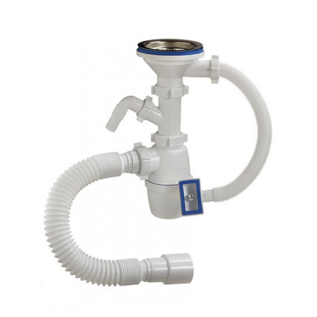 Сифон с большим корпусом и отстойником, выпуском с нержавеющей чашкой д.114мм, отводом для слива от стиральной машины и гибкой трубой 40-40/50, для мойки с прямоугольным переливом. В комплекте идут две прокладки на перелив – прямоугольная на квадратную форму мойки и полукруглая на круглую форму мойки.