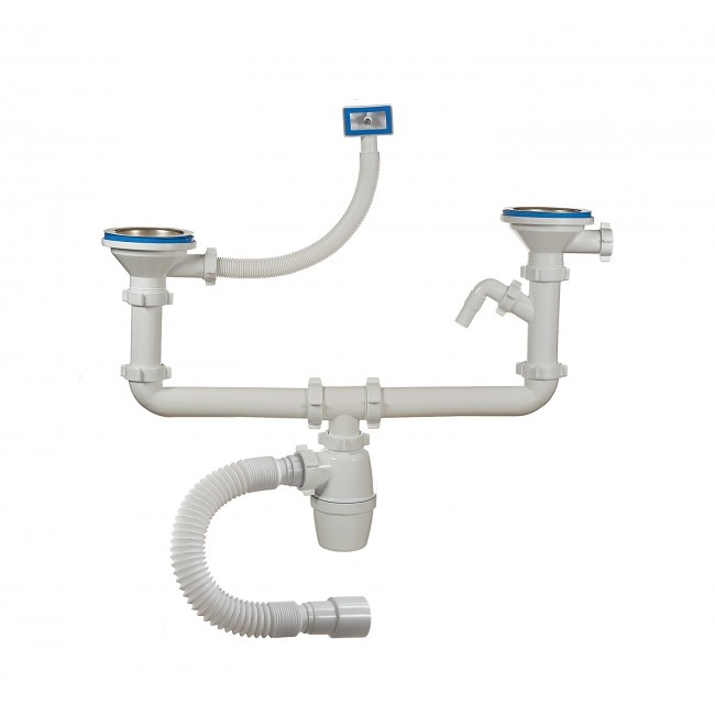 Сифон с большим корпусом и отстойником для двойной одноуровневой или двухуровневой мойки с прямоугольным переливом, с нержавеющей чашкой 114мм и отводом для слива от стиральной машины. В комплекте идёт отвод в канализацию гибкая труба 40-40/50 и две прокладки на перелив – прямоугольная на квадратную форму мойки и полукруглая на круглую. Характеристика: материал сифонаполипропилен; материал решетокнерж. сталь; диаметр решеток, мм 114 x (2 шт.); входное отверстие 2 x 3-1/2"; выходное отверстие, мм 40; регулировка по высоте вып.1, мм 140–210; регулировка по высоте вып.1, мм 170–240; регулировка по высоте сифона, мм 350–450; регулировка по ширине, мм 170–520; один отвод, мм19/22; длина перелива, мм 300;прокладка плоская, мм 63x40x7,5; прокладка полукруглая, мм 63x40x11; гибкая труба, мм 40–40/50; длина гибкой трубы, мм 310–650.