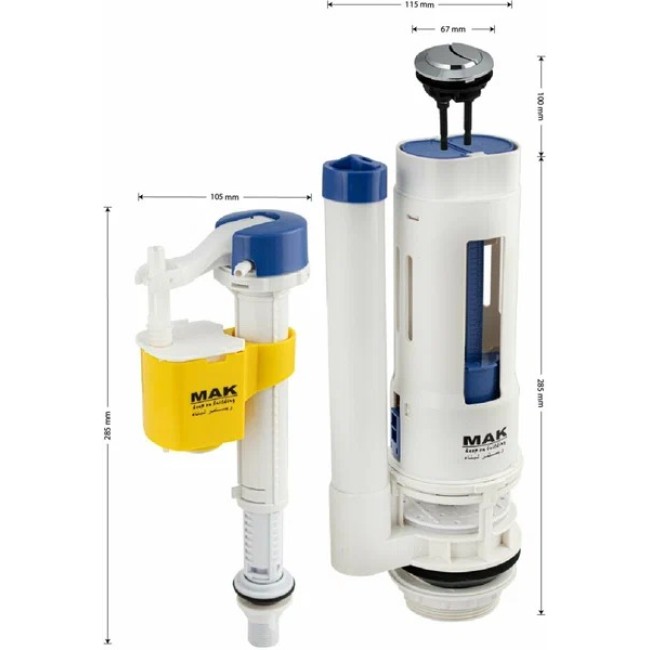 Комплект для бачка унитаза, ко всем моделям, универсальный, состоящий из впускного нижнего и выпускного клапана. Сливной механизм бачка имеет хромированную кнопку с двумя режимами слива, универсальный, подходит для бачков различной высоты, регулировка выпускного клапана производится ползунком на корпусе. Регулировка уровня кнопок смыва происходит путем подрезания на нужную длину. Изделие выполнено из высококачественного пластика АБС, который обеспечивает длительное использование без поломок, отличается пониженным уровнем шума. Может устанавливаться в любом типе бачка с боковой подводкой для подачи воды. Габаритные размеры: высота 285 мм, ширина 115 мм, подключение 1/2, наружняя резьба. Вес - 1,1 кг, объём - 0,00599 м3.