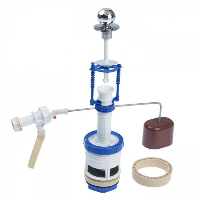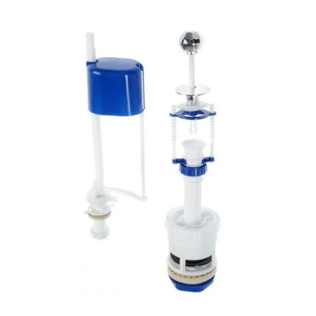 Арматура для бачка унитаза РБМ АС6.1 оснащена нижним подводом воды и универсальным клапаном. Её сливная система со штоком позволяет максимально очищать чашу унитаза за один смыв водой. Ручка штока выполнена в белом цвете и подойдет по дизайну к любой модели сливного бачка.