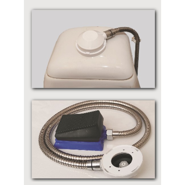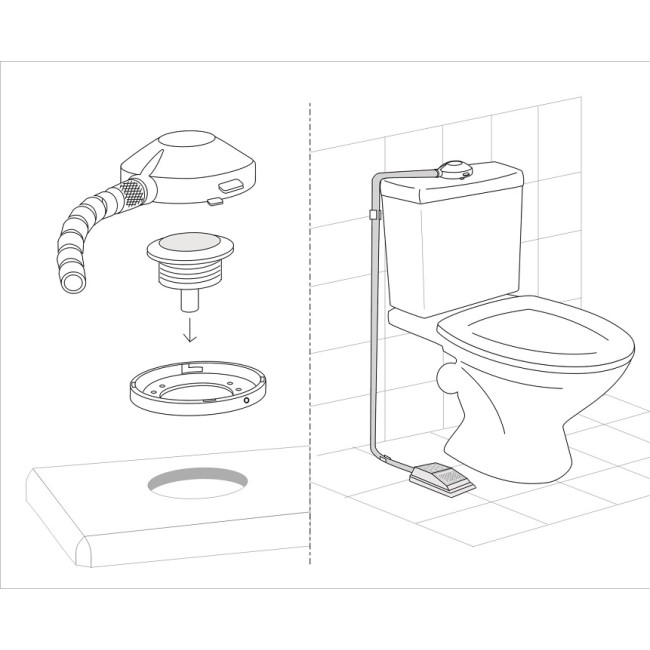 Также состоит из двух узлов: пневмоприводной головки закрепляемой в крышке бачка и напольной педали.