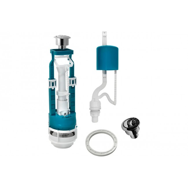 Количество в упаковке: 20шт. Арматура-комплект предназначена для установки в бачок унитаза, для наполнения и подачи воды на смыв в унитаз. Приспособление выполнено из пластика. Арматура с нижней подводкой. Оснащена кнопкой с двумя режимами для полного слива бачка и частичного для экономии воды.