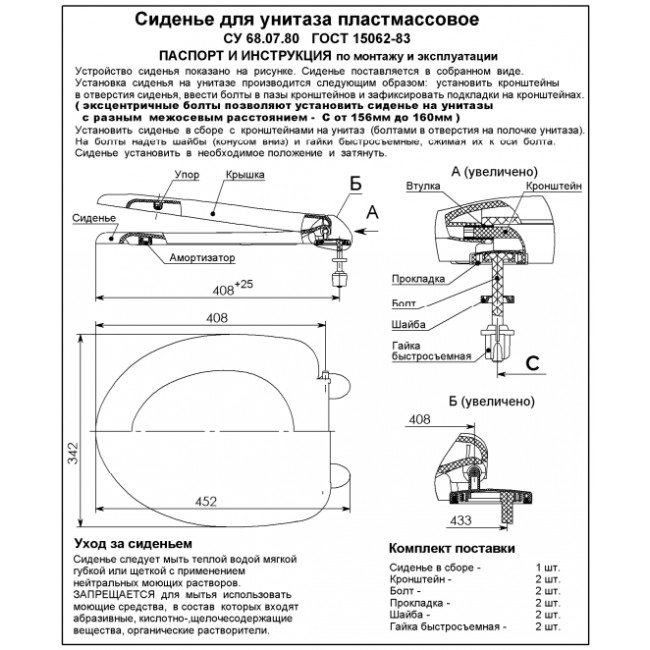 Сиденье изготавливается из высококачественных материалов, безопасных для здоровья, соответствует форме унитаза, прекрасно дополняя его внешний вид. Удобное крепление позволяет быстро установить и надежно закрепить сиденье в оптимальном положении. В комплект поставки, кроме сиденья, входят крепежные элементы, а также паспорт-инструкция по монтажу и эксплуатации.