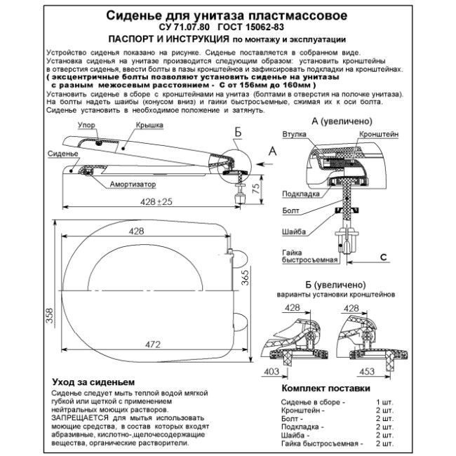 Сиденье изготавливается из высококачественных материалов, безопасных для здоровья, соответствует форме унитаза, прекрасно дополняя его внешний вид. Удобное крепление позволяет быстро установить и надежно закрепить сиденье в оптимальном положении. В комплект поставки, кроме сиденья, входят крепежные элементы, а также паспорт-инструкция по монтажу и эксплуатации.
