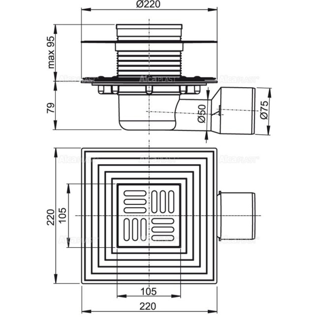 Сливной трап 105х105/50/75, подводка–боковая ALKAPLAST