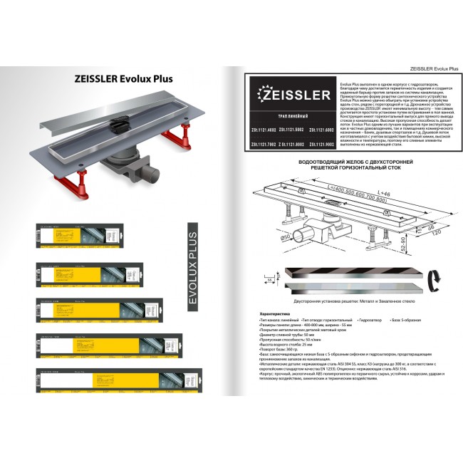 Трап-лоток 400*70 с двухсторонней решеткой горизонтальный сток Evolux Plus