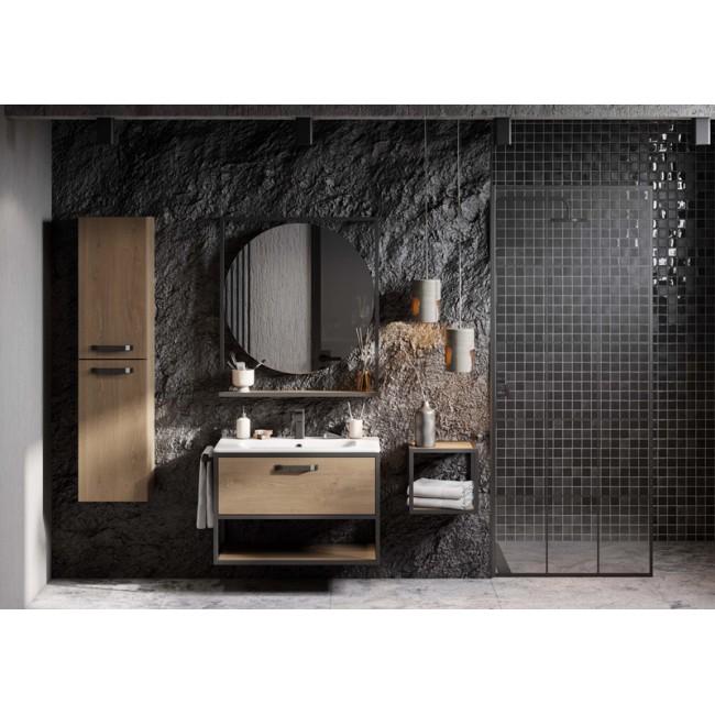Открытая навесная полка в цвете Дуб Кантри выполнена в форме куба и может использоваться как самостоятельный элемент декора и хранения, а также как дополнение к шкафчику из коллекции Лофт Фабрик. Полка выполнена из черного металлического профиля и влагостойкой ламинированной плиты. Она идеально подойдет для того, чтобы расставить в ванной комнате четкие акценты в дизайне и обеспечить дополнительное место для хранения.