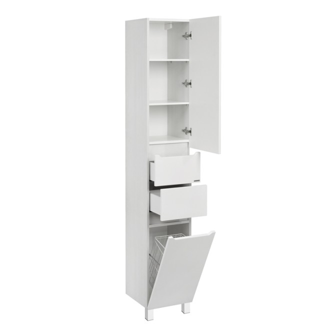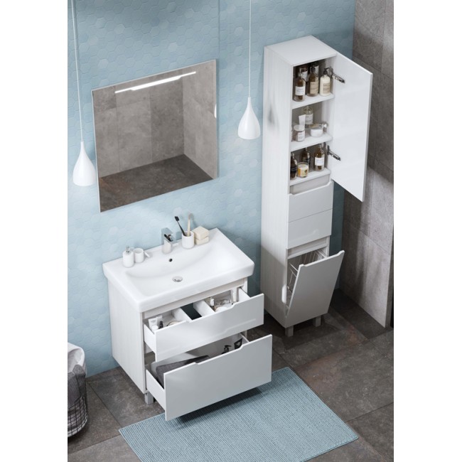 Дизайн шкафа-колонны Дакота не предусматривает лицевую фурнитуру - вместо нее на фасадах сделаны удобные вырезы, которые позволяют без труда открыть ящики. Боковые стенки выполнены из текстурированной влагостойкой ЛДСП в цвете "выбеленное дерево". Фасады колоны окрашены в белый глянец полиэфирной краской ультрафиолетового отверждения, что полностью защищает поверхность от внешних воздействий. П