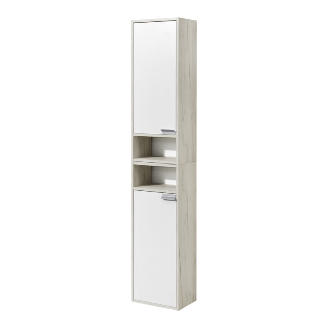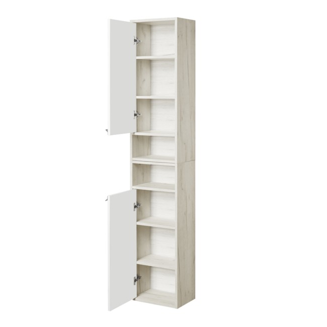 Корпус шкафчика Флай выполнен из влагостойкой ламинированной плиты в трендовом декоре дуб крафт. Фасад окрашен в белоснежный глянцевый цвет полиэфирной краской ультрафиолетового отверждения. Такой способ окрашивания обеспечивает изделию привлекательный внешний вид, а также износостойкость и долговечность. Фасад открывается с помощью изящной и оригинальной ручки от европейского производителя (Испания), петли снабжены доводчиками для комфортного использования. Небольшая открытая ниша идеально подойдет для размещения декора для ванной комнаты или необходимых мелочей. При желании можно разместить два шкафчика Флай один под другим и получить вместительную шкаф-колонну с двумя открытыми нишами.