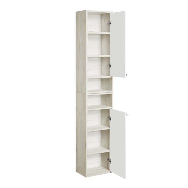 Корпус шкафчика Флай выполнен из влагостойкой ламинированной плиты в трендовом декоре дуб крафт. Фасад окрашен в белоснежный глянцевый цвет полиэфирной краской ультрафиолетового отверждения. Такой способ окрашивания обеспечивает изделию привлекательный внешний вид, а также износостойкость и долговечность. Фасад открывается с помощью изящной и оригинальной ручки от европейского производителя (Испания), петли снабжены доводчиками для комфортного использования. Небольшая открытая ниша идеально подойдет для размещения декора для ванной комнаты или необходимых мелочей. При желании можно разместить два шкафчика Флай один под другим и получить вместительную шкаф-колонну с двумя открытыми нишами.