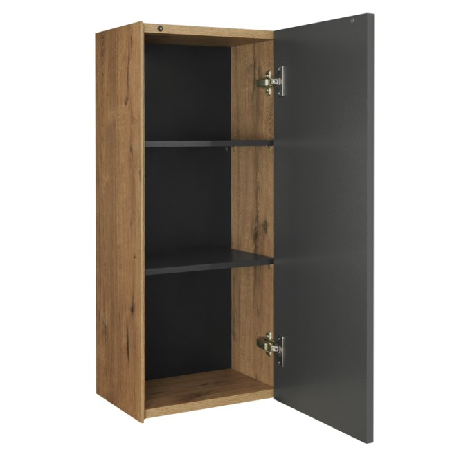 Дополняет коллекцию предметов мебели Сохо шкафчик в созвучном дизайне: боковые стенки ЛВДСП Дуб веллингтон, фасад - плита МДФ в пленке с покрытием soft touch в цвете антрацит. Внутри 2 полки из ламинированной влагостойкой ДСП в цвете антрацит.