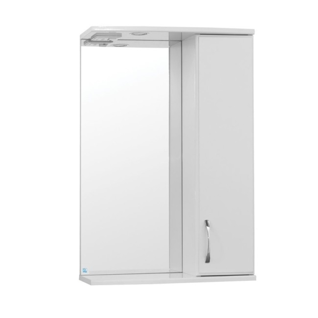 Современное зеркало со шкафчиком расположенное с правой стороны. Дверца оборудована петлями с доводчиками, обеспечивающие плавное закрытие. Внутри шкафчика есть стеклянные полочки. У основания закреплена дополнительная полочка из МДФ на всю длину зеркального полотна.