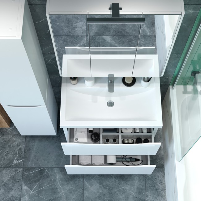 БЕЗ УМЫВАЛЬНИКА. Два выдвежных ящика, оснащены тандемами частичного выдвижения с системой плавного и бесшумного закрывания BLUMOTION фирмы BLUM (Австрия)