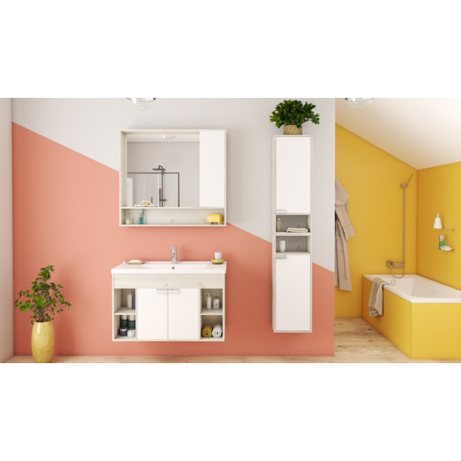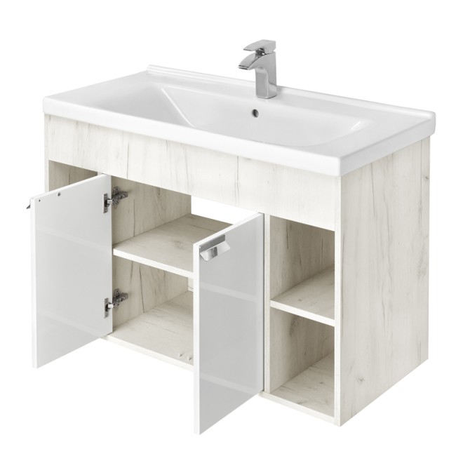 Тумба Флай 100 в современном стиле сочетает в себе два цвета - белоснежный глянец и трендовый декор дуб крафт. Выполненная из влагостойкой ламинированной плиты тумба обладает простым и удобным функционалом - в центре за распашными фасадами-створками находится вместительное отделение с регулируемой по высоте полкой в цвете дуб крафт, а слева и справа - открытые ниши, на которых так приятно разместить красивые мелочи и декор для ванной комнаты. Фасады открываются с помощью изящной и оригинальной ручки от европейского производителя (Испания), петли снабжены доводчиками.Фасады тумбы окрашены полиэфирной краской ультрафиолетового отверждения. Такой способ окрашивания обеспечивает изделию привлекательный внешний вид, а также износостойкость и долговечность.