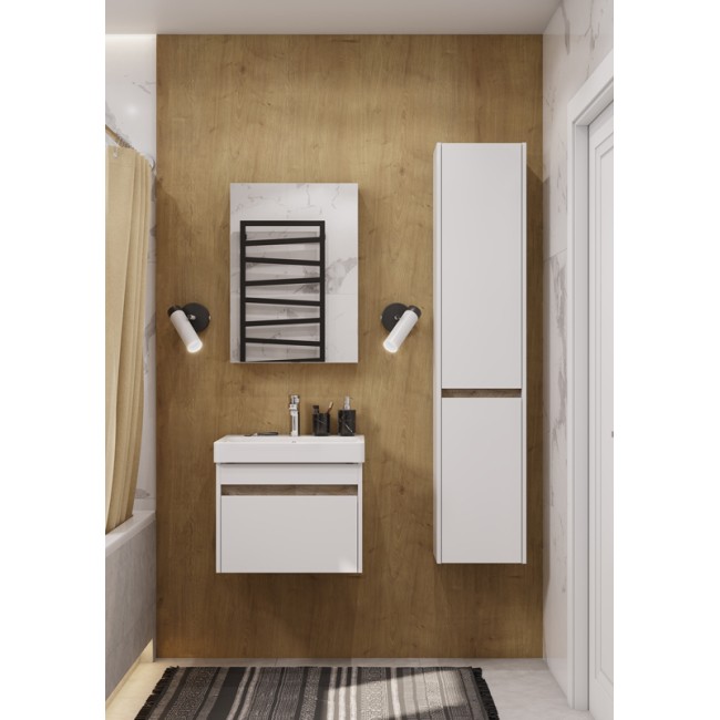 Тумба МАРТИ 55 отличается вместительностью и удобством в использовании: при желании в ящике можно организовать хранение не только шампуней и кремов, но и, например, полотенец. При этом тумба МАРТИ смотрится интересно благодаря выпилу на фасаде, который позволяет открывать тумбу за фасад: в углублении видна контрастная вставка в древесной отделке. Эта акцентная деталь придает модели графичность и позволяет подчеркнуть правильные пропорции тумбы. Корпус и боковые стенки изготовлены из влагостойкой ламинированной ДСП, окрашенной в белый цвет специальной краской ультрафиолетового отверждения для защиты мебели от влаги в условиях ванной комнаты. Декоративная вставка в цвете дуб эндгрейн.