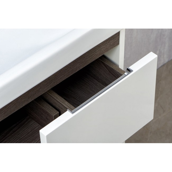 Корпус из влагостойкой ЛДСП и фасады из высококачественной МДФ отлично подходят для пространств с повышенной влажностью. Контрастное сочетание белого глянца и стильной расцветки грецкий орех добавляет модели выразительности. Несмотря на компактные размеры, тумба достаточно вместительна: справа находятся два выдвижных ящика со встроенной системой плавного выдвижения, а слева за фасадом-створкой скрыт дополнительный отсек для хранения. Ручки, изящно интегрированные в фасады, обеспечивают удобную и комфортную эксплуатацию. Строгий и лаконичный дизайн модели подчеркивает гладкая поверхность фасадов без выступающих элементов.
