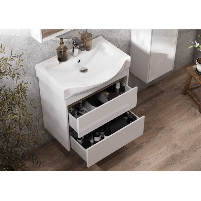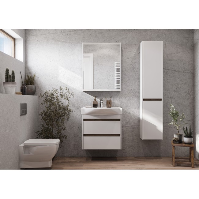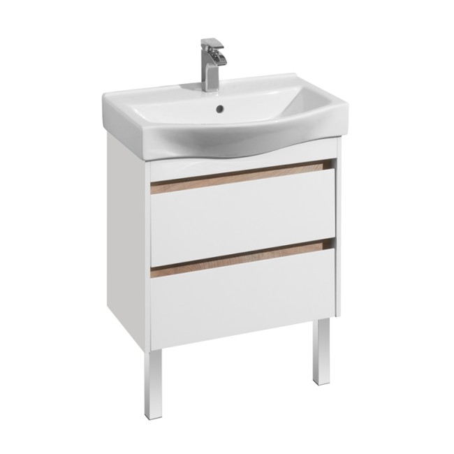 Тумба Нортон 65 в лаконичном дизайне универсальна для любого интерьера ванной комнаты. Корпус тумбы выполнен из влагостойкой ЛДСП, а фасады из МДФ в белой глянцевой покраске. Дизайн тумбы подчеркивает декоративная вставка из ЛДСП с фактурой натурального дерева дуб эндгрейн. Конструктивно тумба состоит из 2 вместительных ящиков, установленных на направляющие с доводчиками для комфортного использования. На тумбе нет выступающих деталей и фурнитуры, открытие ящиков реализовано за счет удобного выреза на фасаде. Тумба комплектуется белоснежной раковиной Беверли от бренда Santek. Тумбу можно использовать в двух вариантах: подвесную или дополнительно приобрести опоры 1A222703SI000.
