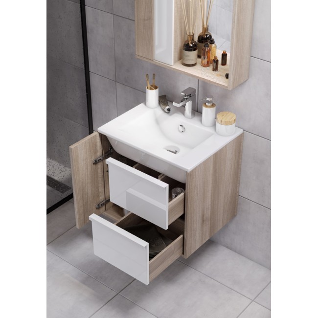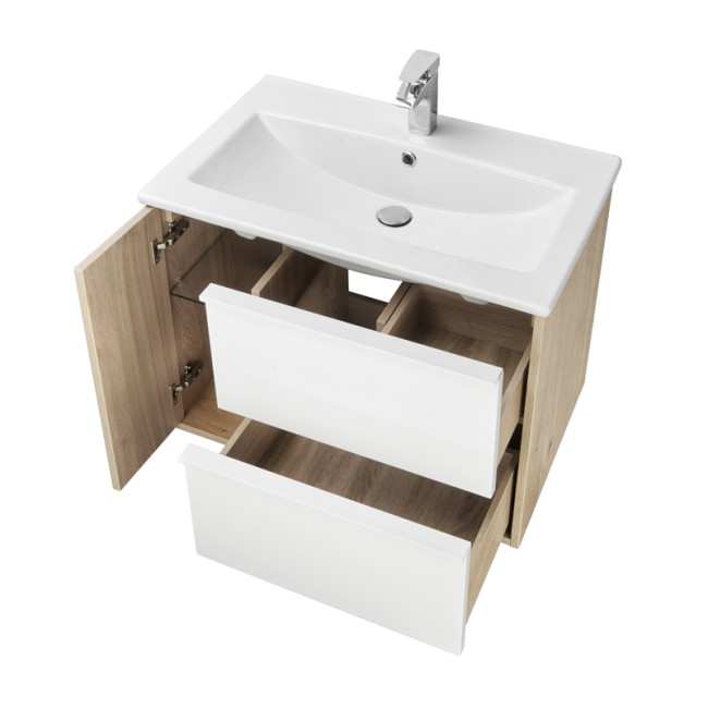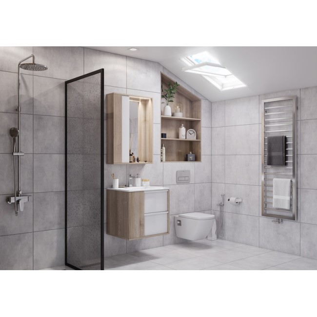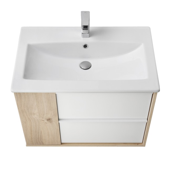 Дизайн элегантной и вместительной тумбы Бостон 75 от AQUATON в современном стиле сочетает в себе два цвета отделки - белоснежный глянец и древесный декор под натуральное дерево. Выполненная из влагостойкой ламинированной плиты тумба обладает простым и удобным функционалом. Слева за распашным фасадом-створкой находится отделение с регулируемой по высоте стеклянной полкой. Справа расположены белоснежные фасады, которые открываются с помощью профильной ручки от европейского производителя. Удобство и комфорт при использовании обеспечивают ящики и петли с доводчиками.