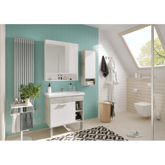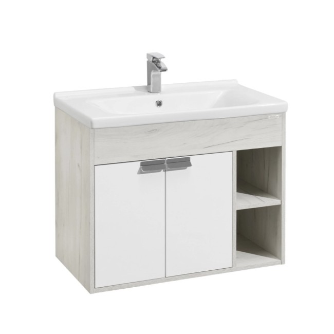 Тумба Флай 80 в современном стиле сочетает в себе два цвета - белоснежный глянец и трендовый декор дуб крафт. Выполненная из влагостойкой ламинированной плиты тумба обладает простым и удобным функционалом - слева за распашными фасадами-створками находится вместительное отделение с регулируемой по высоте полкой в цвете дуб крафт, а справа - две открытые ниши, на которых так приятно разместить красивые мелочи и декор для ванной комнаты. Фасады открываются с помощью изящной и оригинальной ручки от европейского производителя (Испания), петли снабжены доводчиками. Фасады тумбы окрашены полиэфирной краской ультрафиолетового отверждения. Такой способ окрашивания обеспечивает изделию привлекательный внешний вид, а также износостойкость и долговечность.