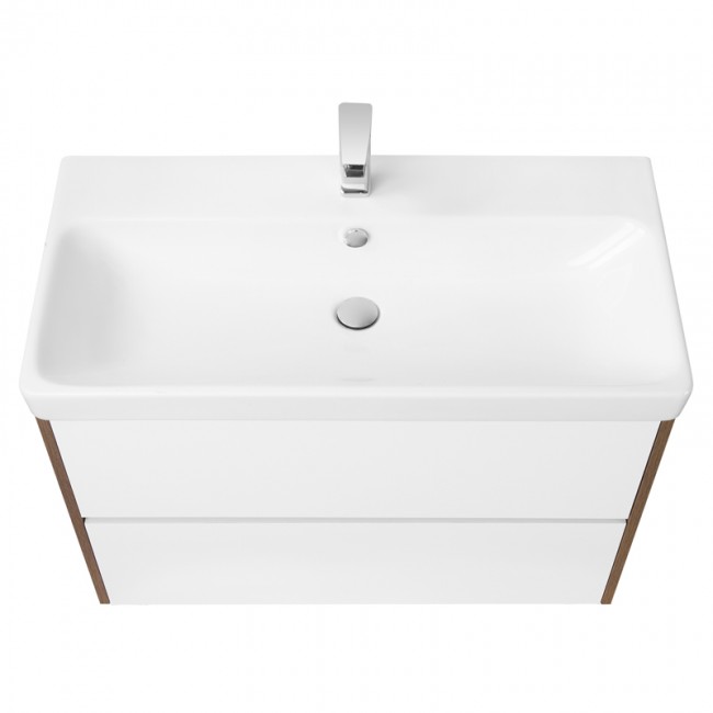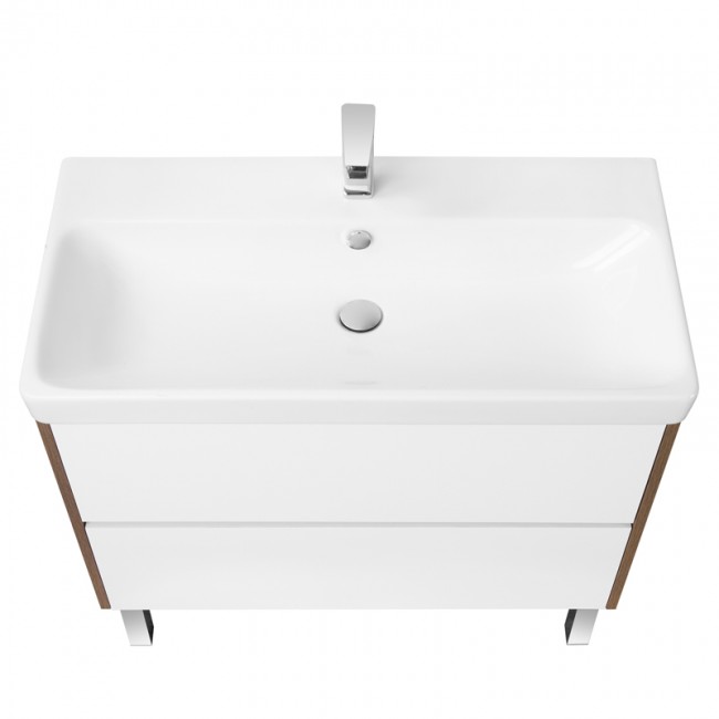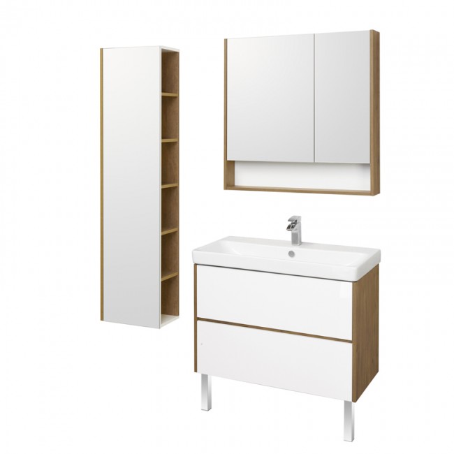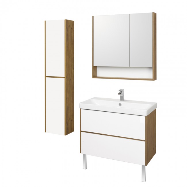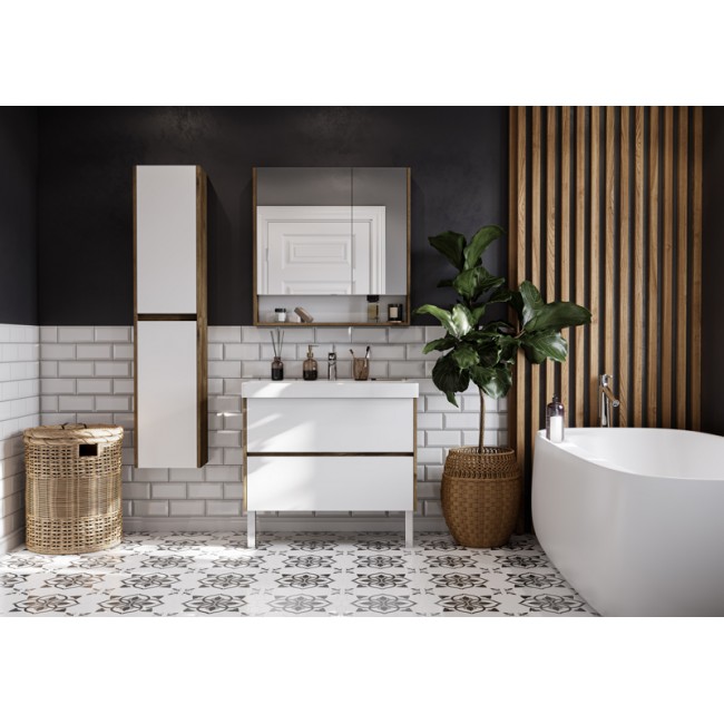 Тумба Сканди 90 выполнена в популярном минималистичном скандинавском стиле. Корпус тумбы выполнен из влагостойкой ЛДСП в декоре натурального дерева, а фасады в белой глянцевой покраске. Конструктивно тумба состоит из 2 вместительных ящиков, установленных на направляющие с интегрированной системой push-to-open для комфортного использования. На тумбе нет выступающих деталей и фурнитуры, открытие ящиков реализовано нажатием на фасад. Тумба комплектуется белоснежной раковиной Адриана от бренда Santek. Тумбу по желанию можно использовать в двух вариантах: как подвесную или дополнительно приобрести опоры.