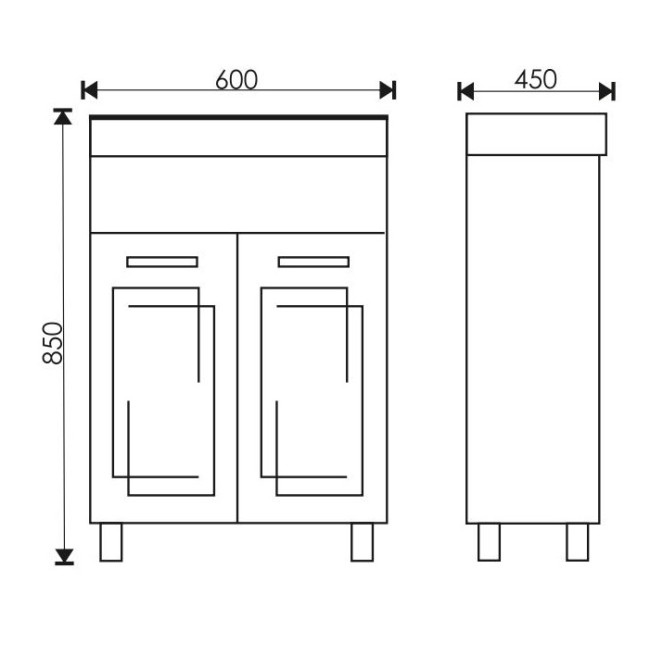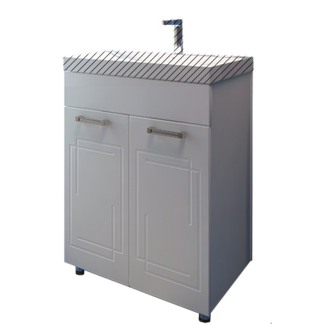 БЕЗ УМЫВАЛЬНИКА. Корпус Тумбы из МДФ 16 мм облицован глянцевой пленкой ПВХ цвет- белый фасад МДФ 16 мм облицован глянцевой пленкой ПВХ цвет- белый и украшен фрезировкой. Петли с доводчиками, дизайнерская ручка метал 128мм, цвет- хром.2 передние ножки метал 100 мм, цвет -хром. 2 задние ножки из пластика 100 мм.