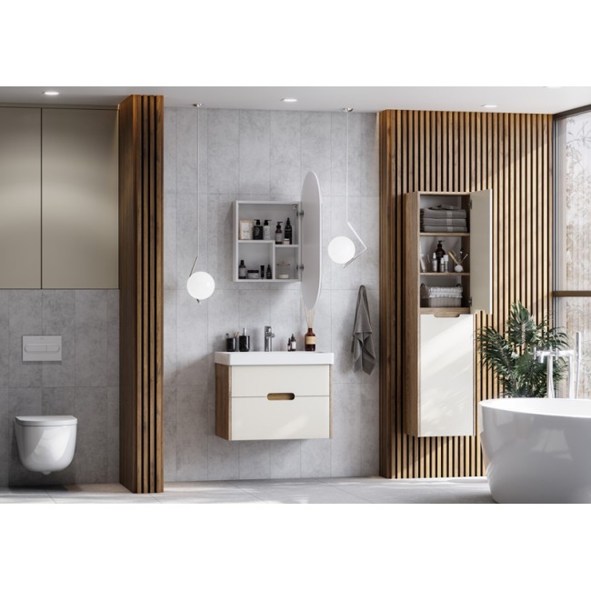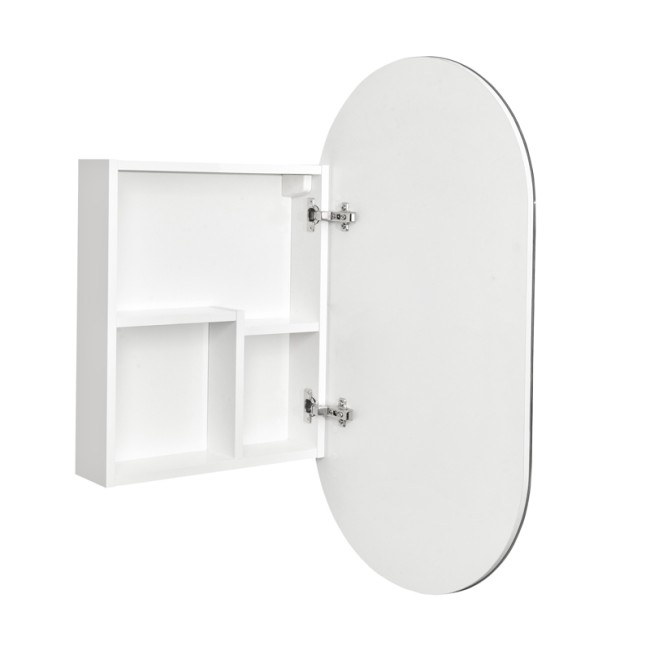 Зеркальным шкаф необычной формы, внутренне пространство которого поделено на ассиметричные секции, позволяющие разместить косметические предметы различной высоты и объема. Фасад оснащен петлями с доводчиком для комфортного использования. Зеркальный шкаф комплектуется регулируемыми навесами.