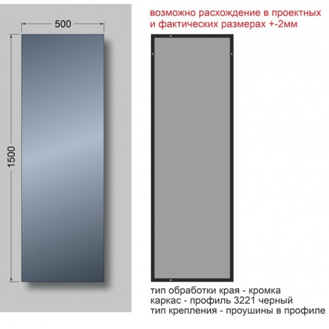 Зеркало 500х1500 с еврокромкой в черном алюминиевом профиле 2420 универсальное крепление КЗСК