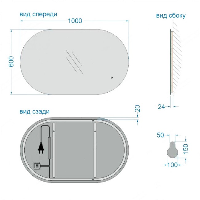 Зеркало 60*100 LED подсветкой 6000К 9,6 Вт/м с сенс.выкл., унив. крепление 575ску КЗСК