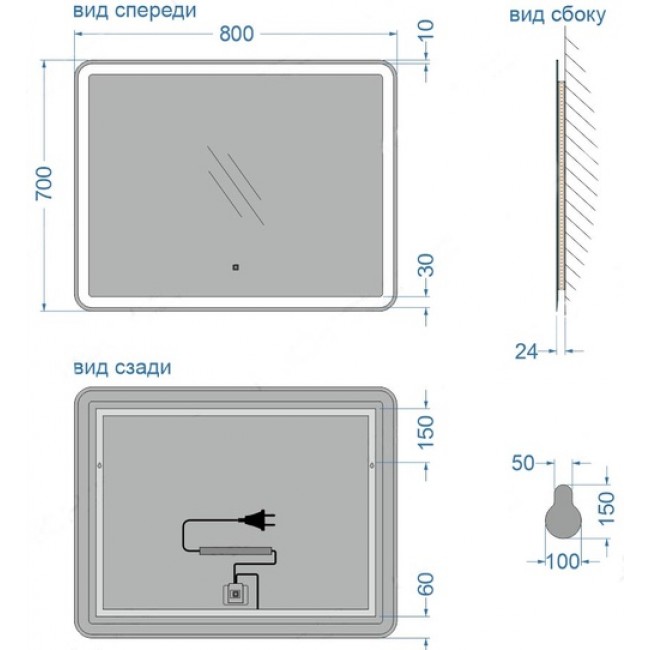 Зеркало 70*80 LED подсветкой 4000К 9,6 Вт/м с сенсорным выключателем, универсал крепление 348ску КЗСК