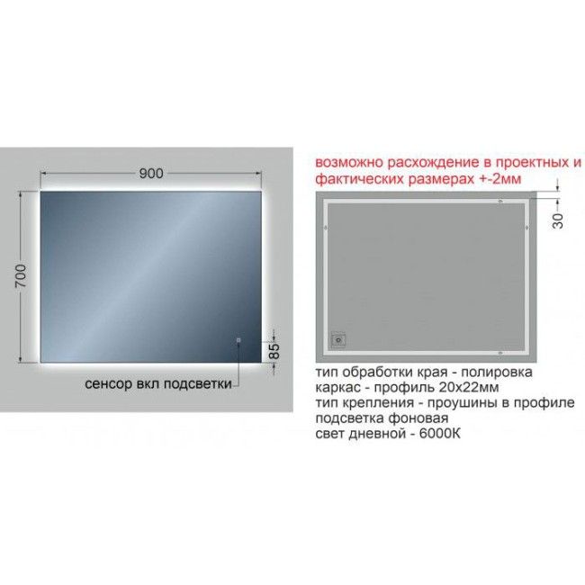 Зеркало 70*90 LED подс.6000К 9,6 Вт/м с полировкой, сенс.выкл, 320ску КЗСК