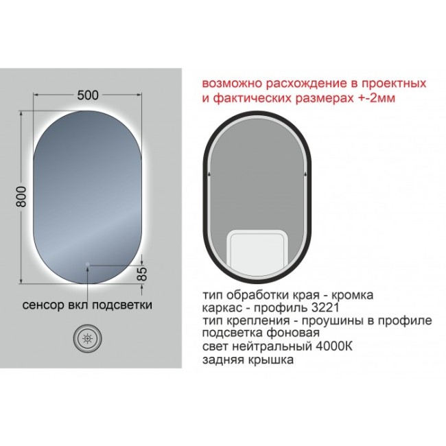 Зеркало 80*50 LED подсветкой 4000К 9,6 Вт/м с сенсор. выкл. 475ск черный КЗСК
