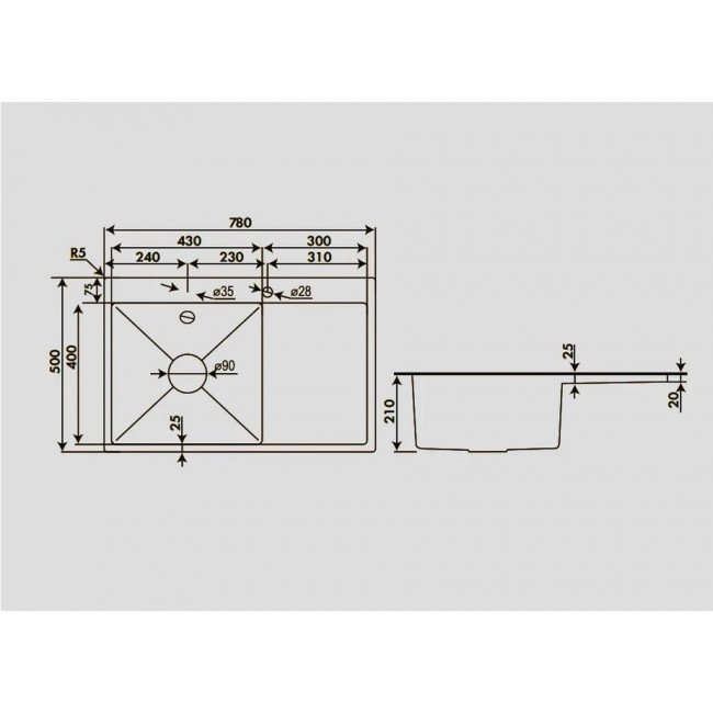 Мойка HOFFGER 7850-L SATIN, сифон, толщ. 1+3мм 780*500*225мм