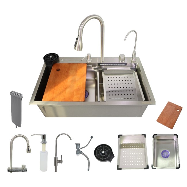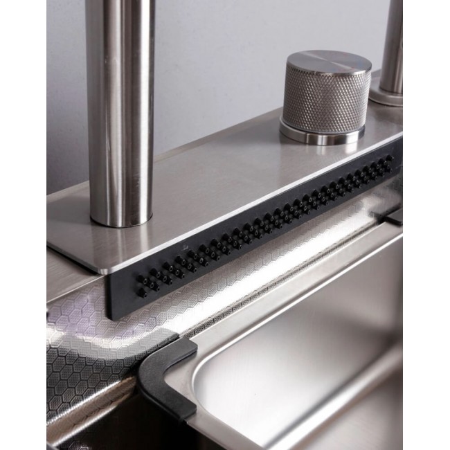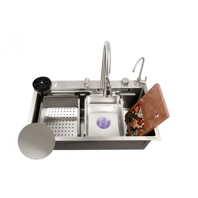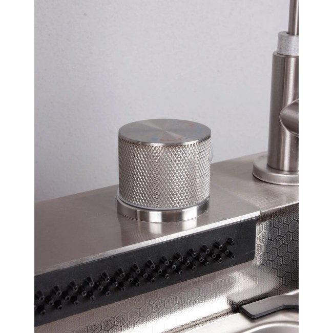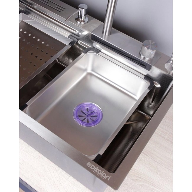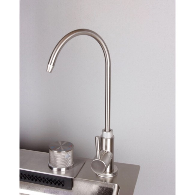 Управление через диск (без клавиш переключения режимов) Комплектация: Раковина, сифон, встраиваемая мойка со сливом, колландер, разделочная доска, мойка для стаканов, кран для питьевой воды, шланги горячей/холодной воды, смеситель с гибким изливом, подставка для ножей