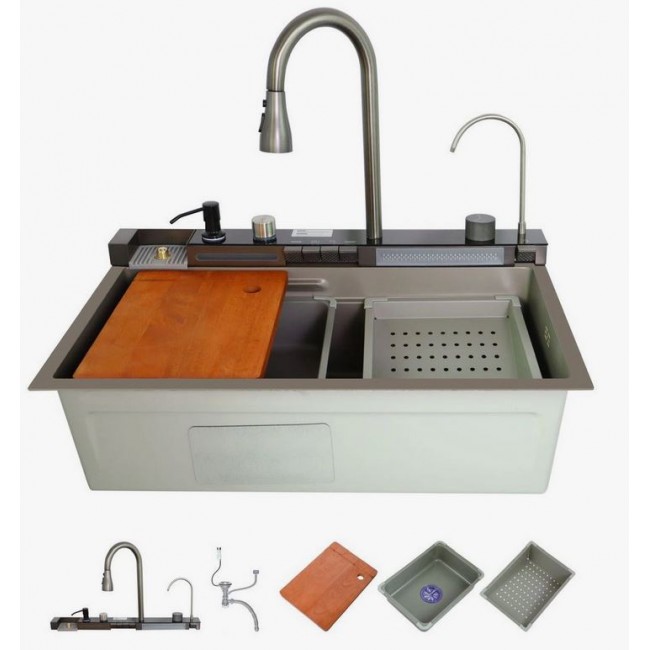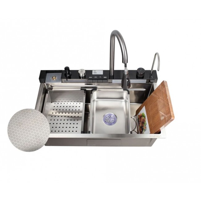Комплектация: Раковина, сифон, встраиваемая мойка со сливом, колландер, разделочная доска, мойка для стаканов, кран для питьевой воды, шланги горячей/холодной воды, смеситель с гибким изливом, дозатор, подставка для ножей.