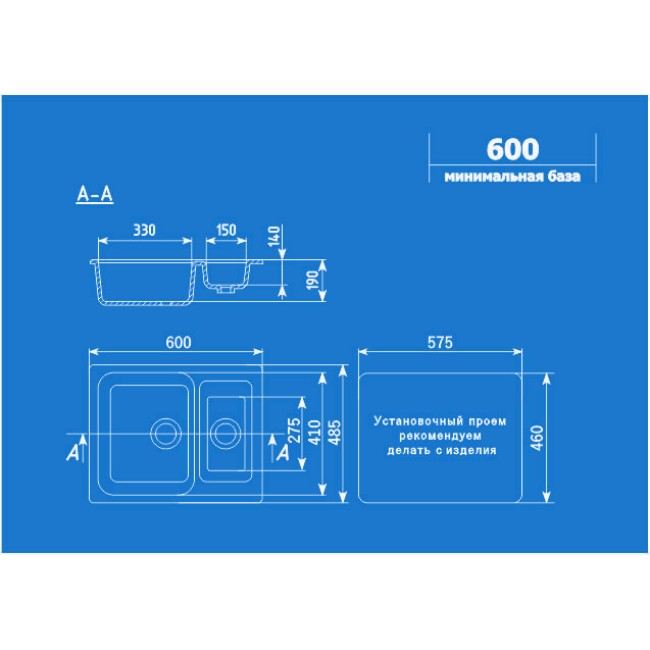 | Монтажная длина отверстия в столешнице, мм | 575 |
