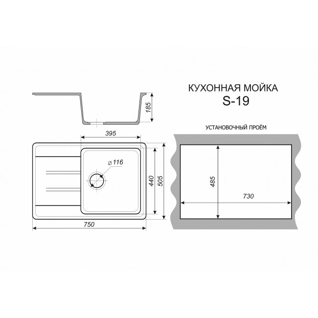 | Монтажная длина отверстия в столешнице, мм | 485 |