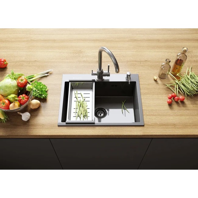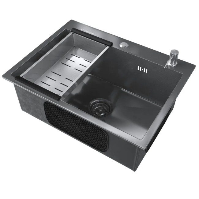Количество чаш: 1-секционная. Минимальная база для изделия: 600 мм. Общий размер: 600 x 450 х 220 мм. Размер чаши: 550 х 350 х 210 мм. Глубина чаши: 210 мм. Установочный проем: 580 х 430 мм. Отверстие под смеситель: 35 мм. Отверстие под дозатор: 28 мм. Крыло: нет. Размер коландера: отдельный коландер. Диаметр слива: 90 мм. Цвет: чёрная брашированная сталь. Материал: нержавеющая сталь марки AISI 304, PVD - покрытие. Тип монтажа: универсальный (врезной, подстольный, интегрированный - вровень со столешницей) Комплектация: 1. Сливная арматура с гофротрубой, 2. Дозатор для жидкого моющего средства, 3. Коландер из нержавеющей стали, 4. Технический паспорт и гарантийный талон. Логистическая информация