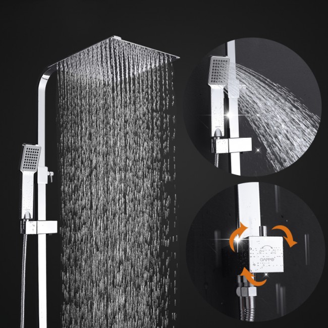 Современная душевая система с верхним душем серии G2408 GAPPO выполнена из латуни в цвете хром, высота 1300 мм. В комплекте душевая лейка 250х250 мм с держателем. Поворотный переключатель с тропического душа на душевую лейку производится поворотом, а так же в комплекте душевой шланг и шланг для подключения к смесителю. Идеально подходит для установки в душевых углах и кабинах, а так же в ваннах.