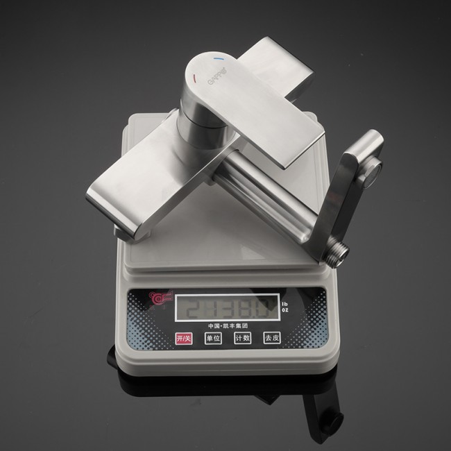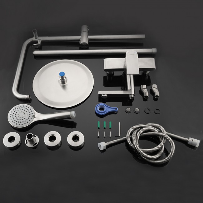 Душевая стойка со смесителем, с душевой лейкой (душевой шланг 150 см. в комплекте) и верхним душем (форма круглая, диаметр 25 см). Цвет сатин. Смеситель изготовлен из нержавеющей стали, короткий поворотный излив является переключателем на душевую лейку. В смесителе используются керамический картридж и аэратор, что обеспечивает бесшумность, уменьшение расхода воды и длительный срок службы смесителя.