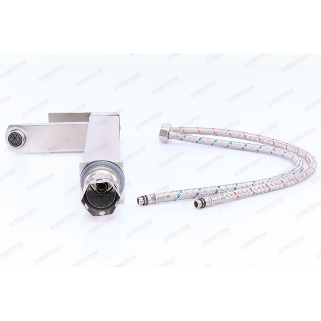 Смеситель из цельно литого корпуса, в современном и модном дизайне из пищевой нержавеющей стали не содержит свинец, со временем не поддается коррозии, имеет удобный в использовании не поворотный излив, картридж с керамическими пластинами и крепиться гайкой, что очень удобно и надежно.