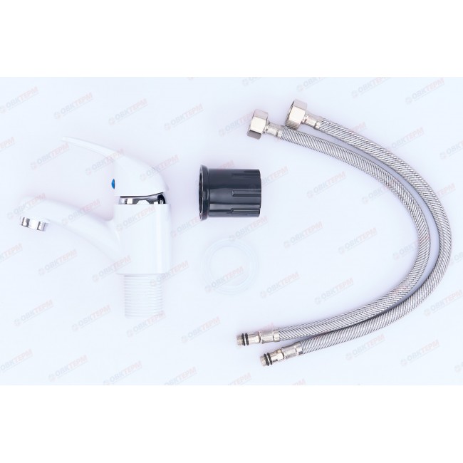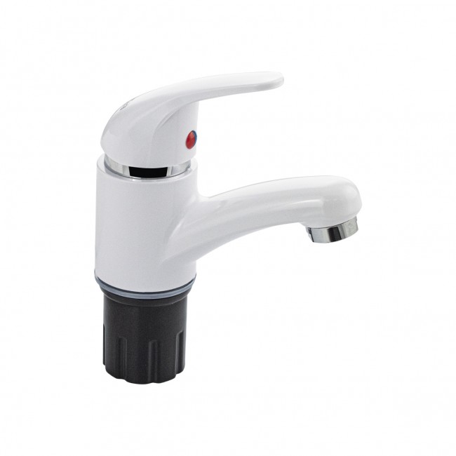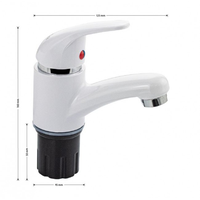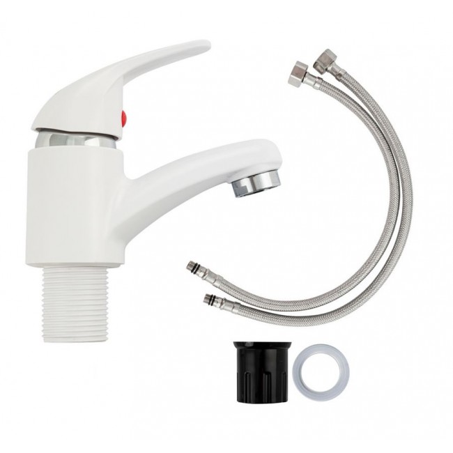 Смеситель для раковины, из высокопрочного пластика АБС - БЕЛЫЙ с коротким изливом, литой корпус, литая ручка, шаровый, Крепление резьба- гайка, картридж d=40 мм. хромированный аэратор для экономии воды.Габаритные размеры: высота 160 мм, длина 145 мм, длина излива 105 мм, диаметр посадочного седла 50 мм, длина резьбы 50 мм, длина подводки 400 мм