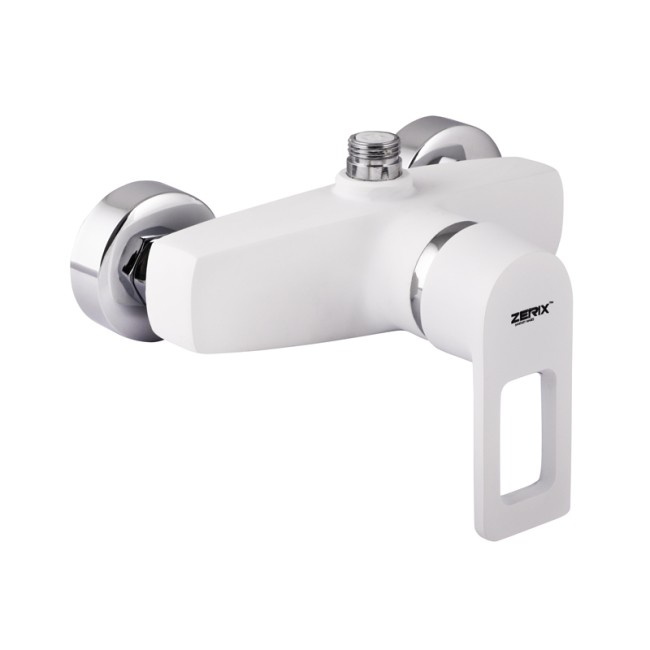 Количество в коробке: 10шт. Смеситель "Z2030-7" разработан фирмой "ZERIX" специально для душевых кабин. Это выражается в соответствующем дизайне. Агрегат состоит из цельной конструкции белого цвета с металлическими вкраплениями. Выглядит такое решение неординарно и украшает любую душевую. Ручка для контроля подачи воды приняла боковое положение - это решение очень интересное и правильное. Поскольку отсутствует излив за ненадобностью, ручку расположили максимально удобно. При этом выход на душевой шланг помещен сверху для практичного применения и минимизации возможных поломок. На приспособлении отсутствуют индикаторы температуры. Крепеж рассчитан на стену и выполняется при помощи муфт и подобной фурнитуры.