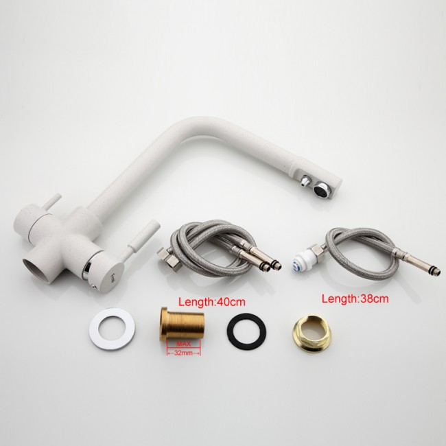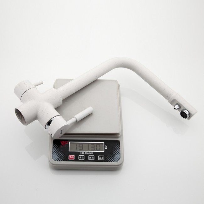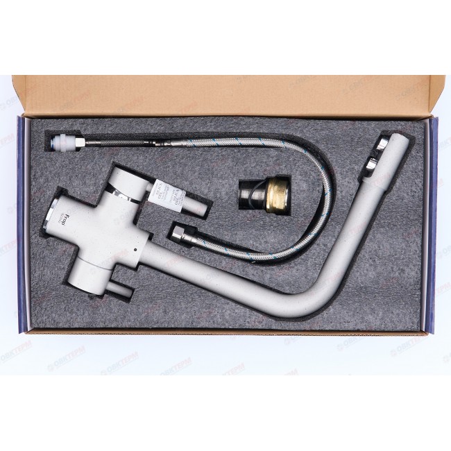 Удобство этой модели заключается в том, что в одном корпусе с современным дизайном конструкторы поместили обычный смеситель с подведением горячей и холодной воды и смеситель от фильтра для питьевой воды.