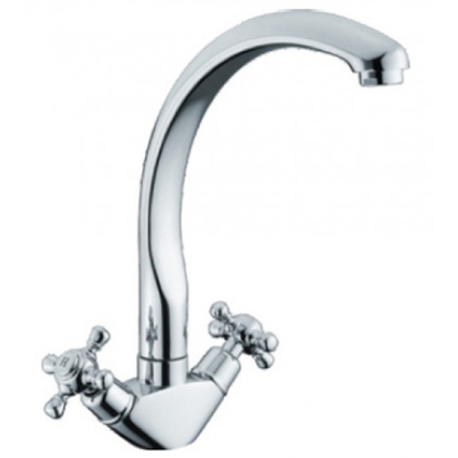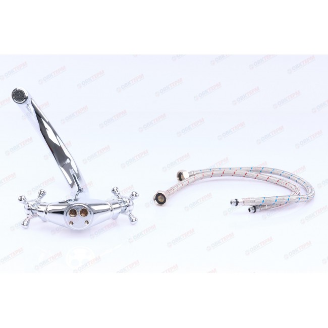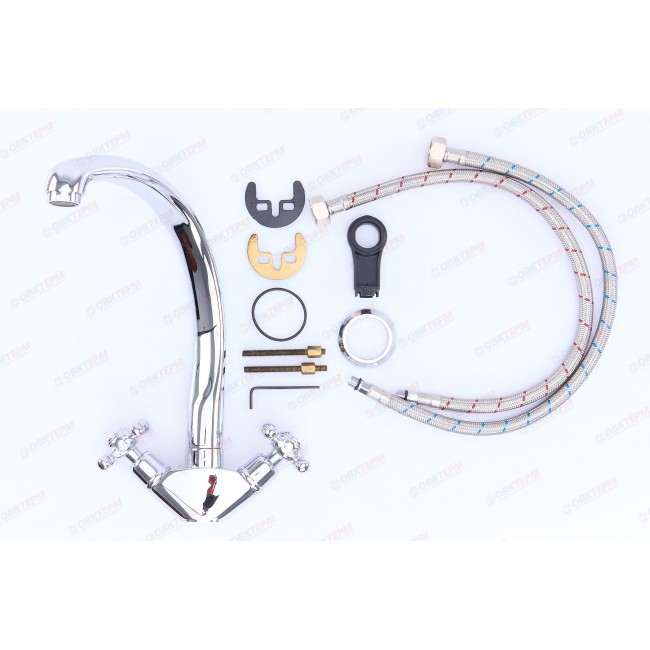 Смеситель для кухни Gappo G4145, имеет два рычага для регулировки напора горячей и холодной воды. Наличие аэратора в данном приборе обеспечивает равномерный поток воды и ее смягчение. Сетка в устройстве отфильтровывает разные примеси. устанавливается на шпильке. Внизу прибора ставится резинка, дабы смеситель не царапал и не ездил по столешнице, далее вкручиваются шпильки в смеситель.