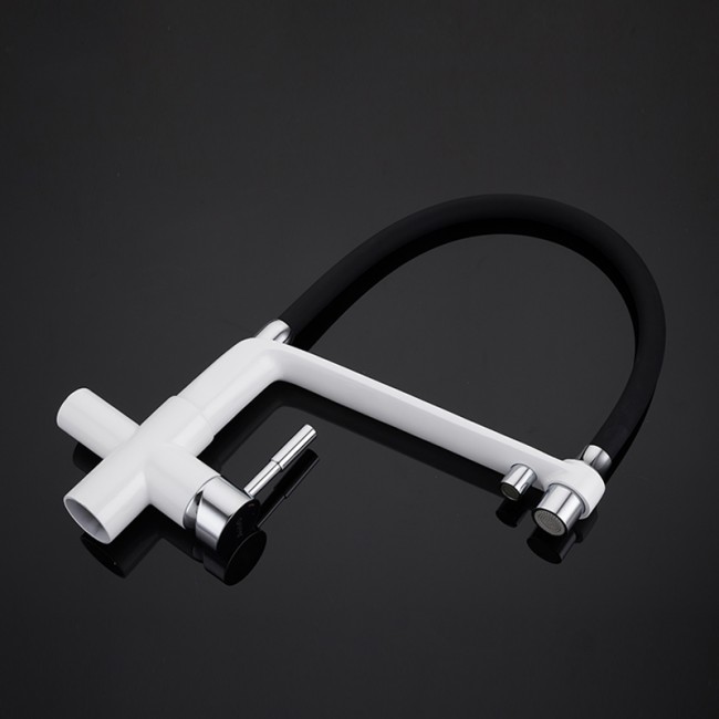 Смеситель для кухни с гибким изливом Gappo G4398-9, прибор имеет одну рукоять для того, чтобы регулировать напор воды. Функциональный прибор оснащен переключателем на обычную и питьевую воду. Оттоки изолированы между собой. Таким образом, обычная водопроводная вода с фильтрованной не смешивается. Наличие аэратора в смесителях обеспечивает равномерную подачу воды и ее относительноесмягчение.