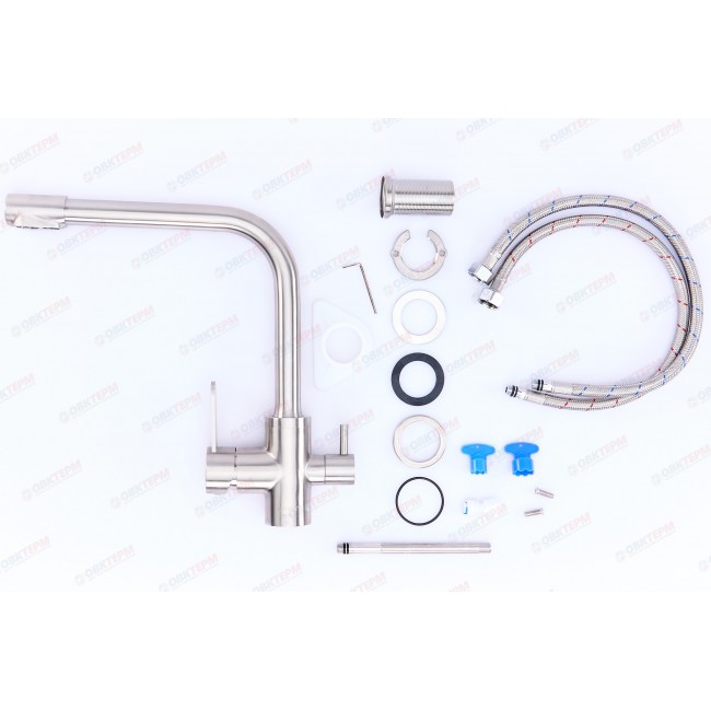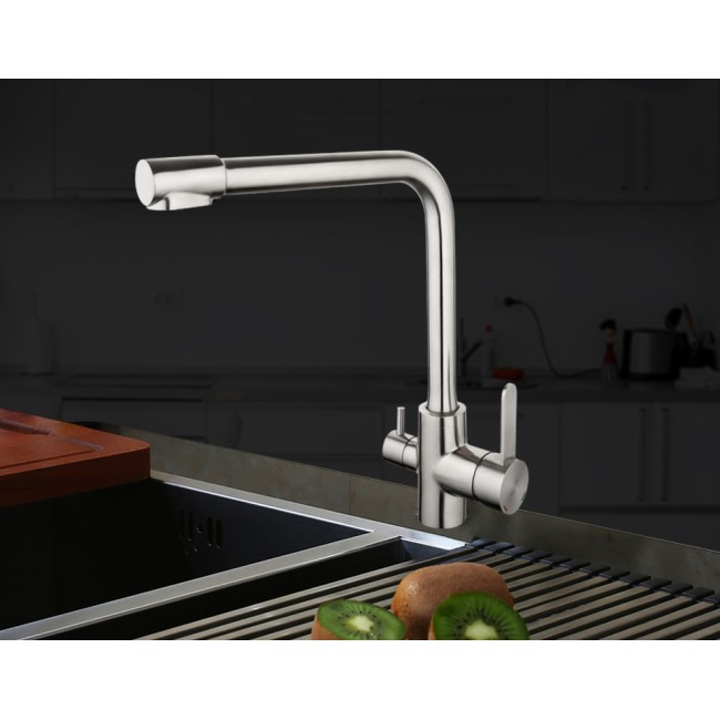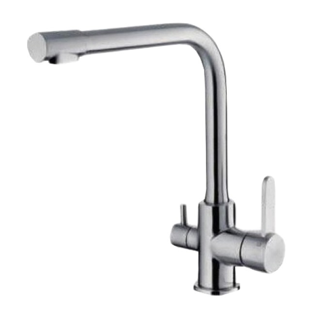 Смеситель для кухни двурычажный - сантехнический прибор, предназначенный для регулирования и смешивания горячей и холодной воды, что позволяет получить единый поток с максимально комфортной температурой. Данный смеситель предназначен для кухонной раковины и представляет собой корпус с изливом, имеющий управляющий элемент в виде рычага, позволяющего "запоминать" температуру воды, использовавшуюся перед этим.