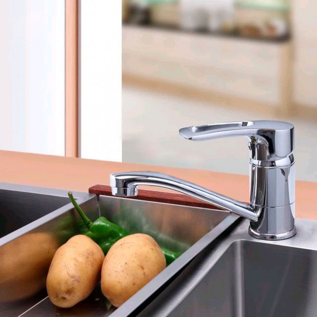 Количество в коробке: 12шт. Смеситель для кухни с поворотным изливом, предназначен для использования в бытовых или общественных помещениях для пуска, смешивания, регулирования температуры и закрытия водного потока на его выходе из системы водоснабжения. Материал корпуса - силумин. Имеется поворотный излив, аэратор.