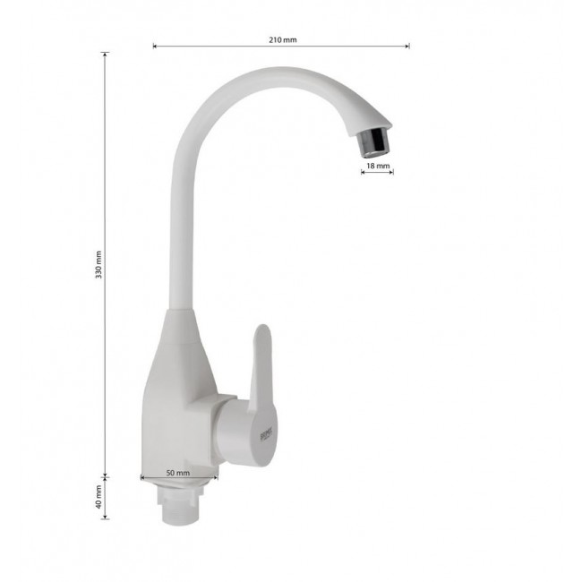 Смеситель для кухонной мойки и раковин, из высокопрочного пластика АБС - БЕЛЫЙ боковой, с высоким С-образным изливом, шаровый, Крепление резьба - гайка, квадратный корпус , картридж d=40 мм, литая ручка, Хромированный аэратор для экономии воды. Габаритные размеры: высота 330 мм, длина 210 мм, диаметр посадочного седла 50 мм , длина резьбы 40 мм, длина подводки 400 мм