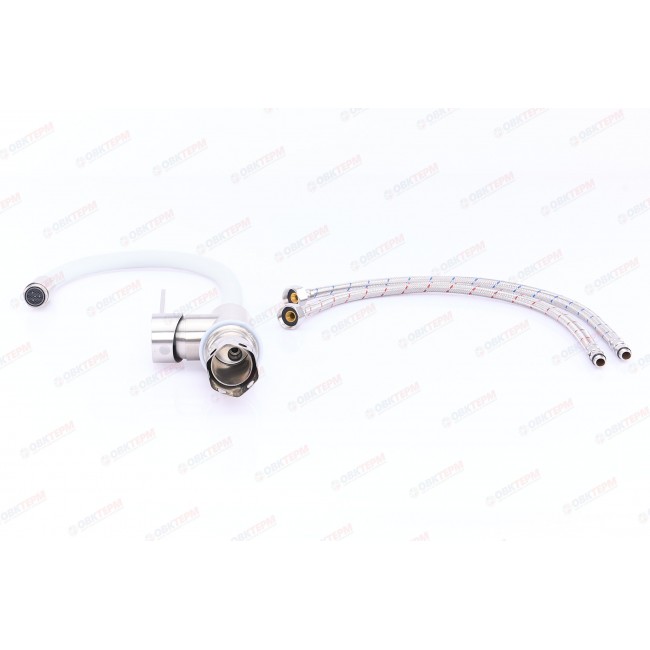 Количество в коробке: 10шт. Смеситель для кухни Zerix изготовлен из высококачественных материалов, которые не подвержены коррозии, корпус устойчив к ударам и появлению трещин. Удобное управление смесителем, благодаря которому можно отрегулировать температуру и напор холодной и горячей воды. Смеситель выполнен в современном дизайне и прекрасно впишется в Ваш интерьер. Особенность смесителя - гибкий силиконовый излив. Запорный элемент - керамический картридж 35 мм. Подключается к трубопроводу двумя гибкими подводками, которые идут в комплекте вместе с крепежным элементом, аэратором и резиновыми прокладками.